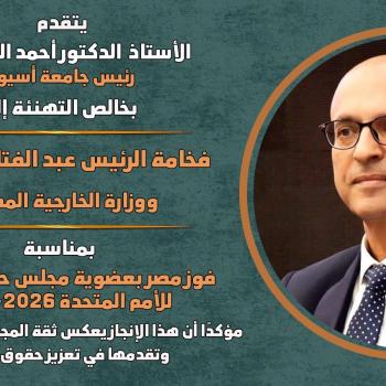 يتقدم الدكتور أحمد المنشاوي، رئيس جامعة أسيوط، بخالص التهنئة لفخامة الرئيس عبد الفتاح السيسي ووزارة الخارجية…