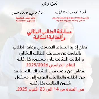 تحت رعاية الدكتور أحمد المنشاوي، رئيس جامعة أسيوط والمكلف بتسيير أعمال جامعة أسيوط الأهلية، تعلن إدارة النشاط الاجتماعي بالجامعة عن انطلاق مسابقة "الطالب المثالي والطالبة المثالية" على مستوى جميع…