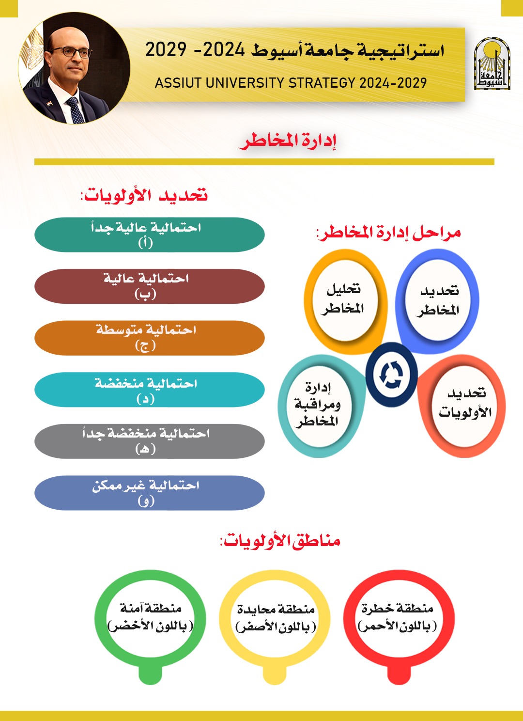 تواصل جامعة أسيوط؛ برئاسة الدكتور أحمد المنشاوي رئيس الجامعة؛ عرض خطتها الهادفة لـ "إدارة المخاطر"؛ ضمن استراتيجية الجامعة (2024 -2029)، وذلك في ضوء توجهها لتنفيذ الاستراتيجية، بما يضمن استدامة عمل الجامعة، والتعامل الأمثل مع الأزمات، والطوارئ، الراهنة، والمستجدة، وذلك وفقاً لأهداف التنمية المستدامة، ورؤية مصر ٢٠٣٠.