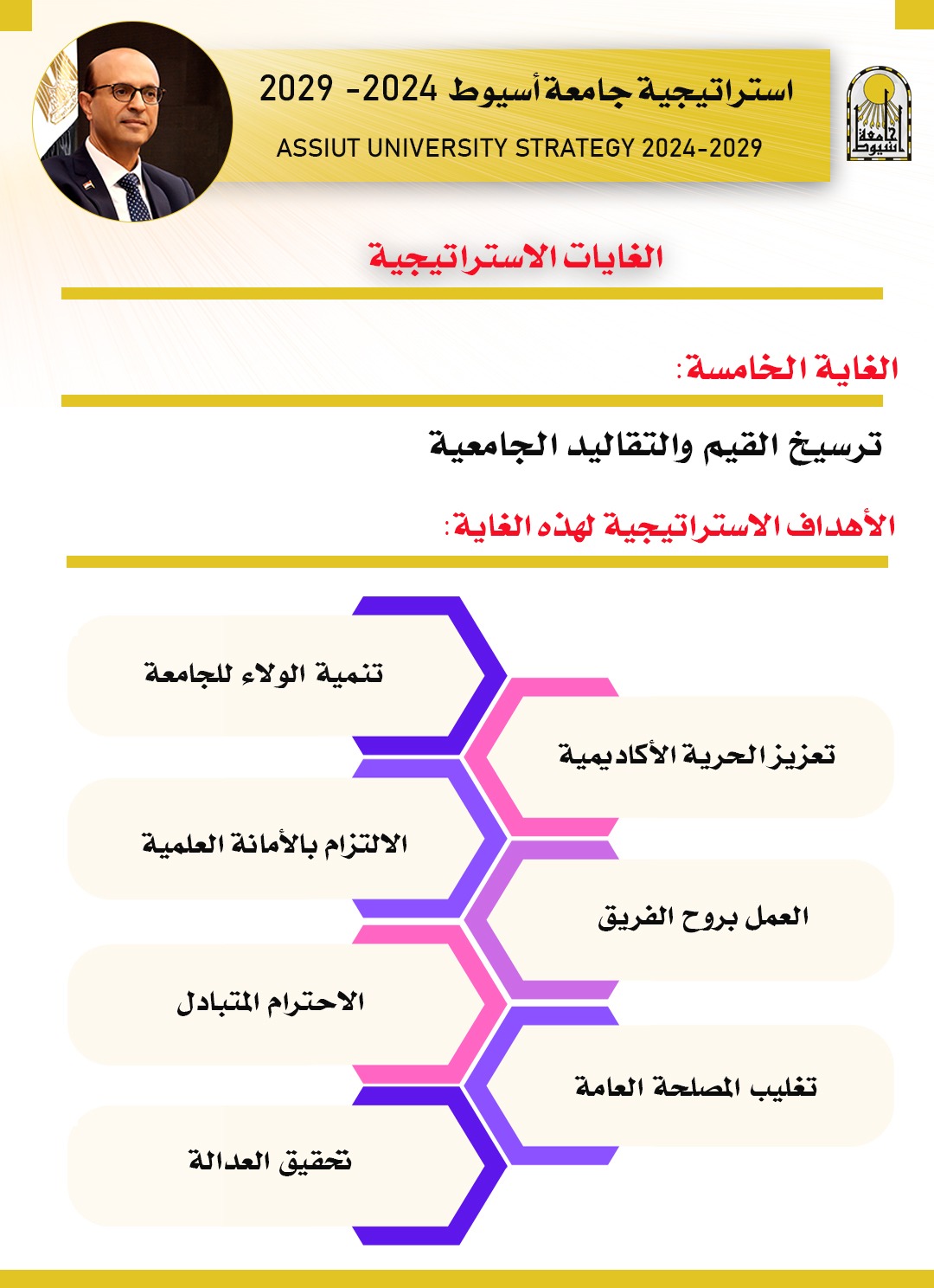 تستهدف استراتيجية جامعة أسيوط؛ الالتزام بمبادئ الحيادية، والموضوعية، وتغليب المصلحة العامة، داخل منظومتها التعليمية؛ بكافة محاورها؛ حفاظاً على انتظام العملية التعليمية، والبحثية بها.