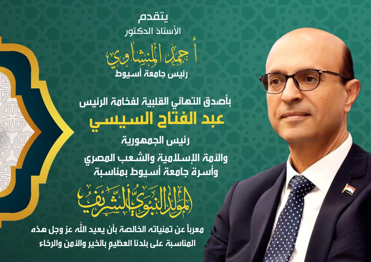 تقدّم الدكتور أحمد المنشاوي رئيس جامعة أسيوط؛ بخالص التهنئة؛ لفخامة الرئيس عبد الفتاح السيسي، بمناسبة ذكرى المولد النبوي الشريف، متمنياً لسيادته التوفيق، والسداد؛ على طريق التعمير، والبناء، والاستقرار نحو جمهورية جديدة تحقق لمصر، وشعبها مستقبل مشرق، وأن يتحقق للشعب المصري العظيم ما يتطلع إليه من تقدم ورخاء، وأن يعيدها المولى عز وجل على شعوب الأُمتين العربية، والإسلامية؛ بالخير، والأمن، والرخاء.