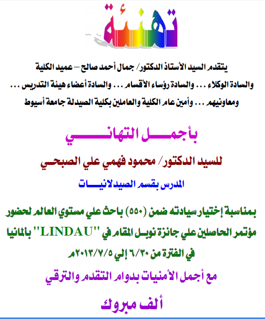 تهنئة من كلية الصيدلة للسيد الدكتور/ محمود فهمي علي الصبحي لإختيار سيادته لحضور مؤتمر الحاصلين علي جائزة نوبل. 8 أبريل 2013 تهنئة من كلية الصيدلة للسيد الدكتور/ محمود فهمي علي الصبحي لإختيار سيادته لحضور مؤتمر الحاصلين علي جائزة نوبل.