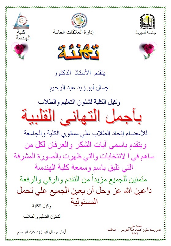تهنئة مقدمة من الأستاذ الدكتور/ جمال أبو زيد عبد الرحيم لأعضاء إتحاد الطلاب علي مستوي الكلية والجامعة 13 مارس 2013 تهنئة مقدمة من الأستاذ الدكتور/ جمال أبو زيد عبد الرحيم لأعضاء إتحاد الطلاب علي مستوي الكلية والجامعة