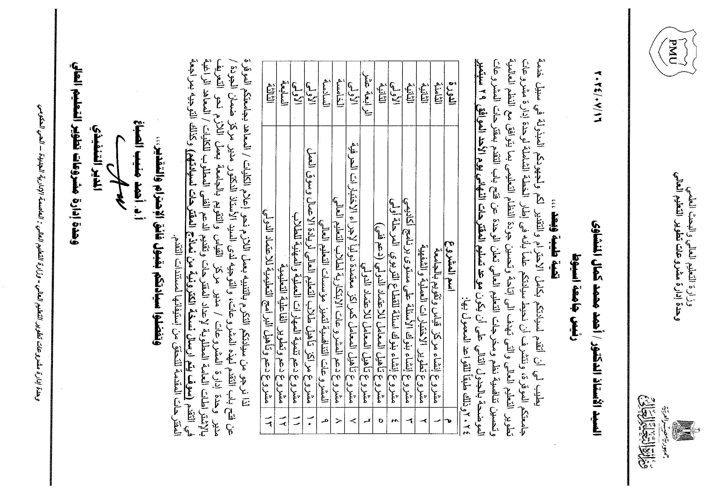 تعلن وحدة تطوير مشروعات التعليم العالي ان اخر موعد لتسلم مختلف مقترحات المشروعات (جودة ومعامل وتميز و قياس وتقويم) هو ٢٩ / ٩ / ٢٠٢٤