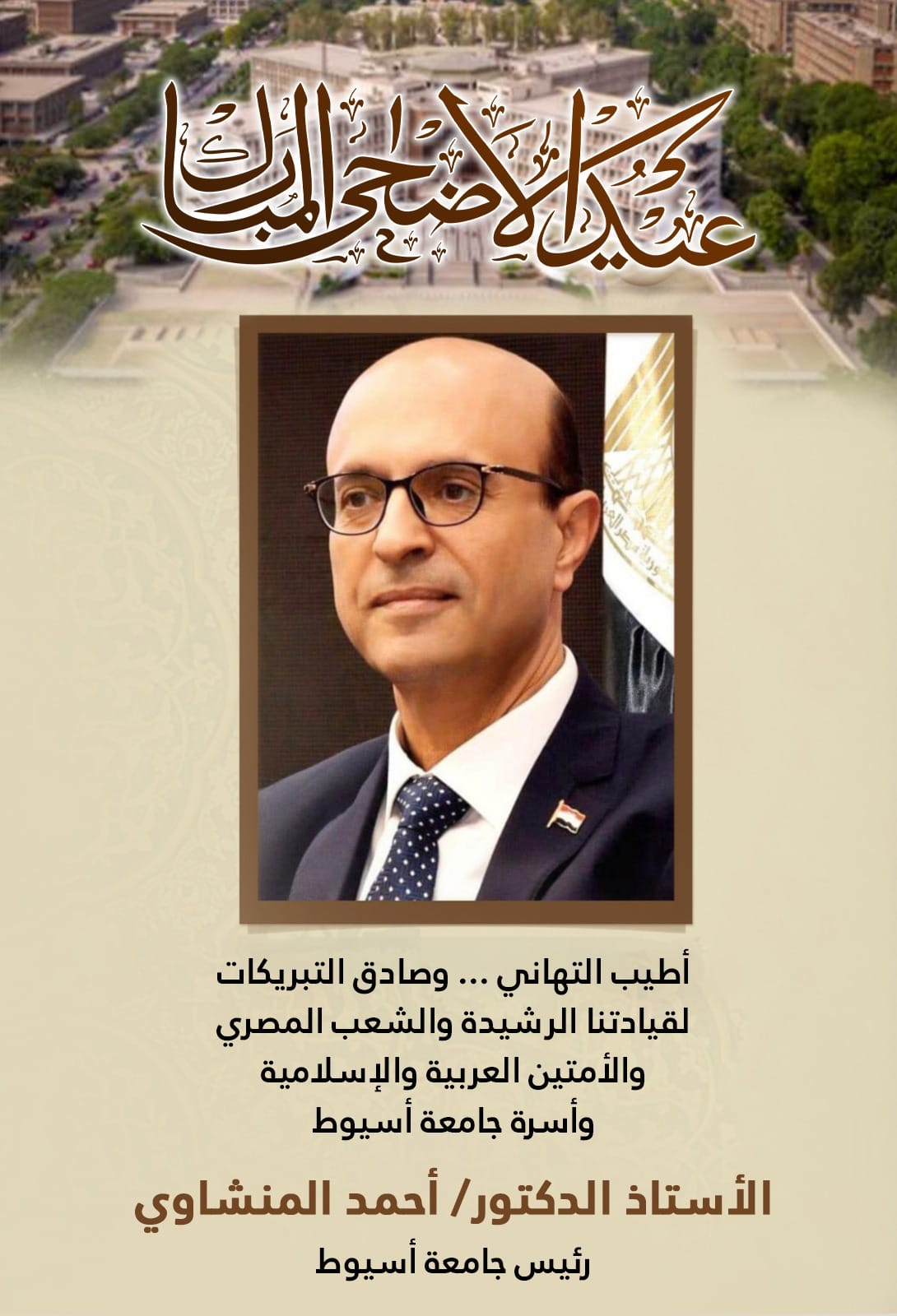 يتقدم الأستاذ الدكتور أحمد المنشاوي رئيس جامعة أسيوط؛ بأرق التهاني القلبية بمناسبة حلول عيد الأضحى المبارك ...
