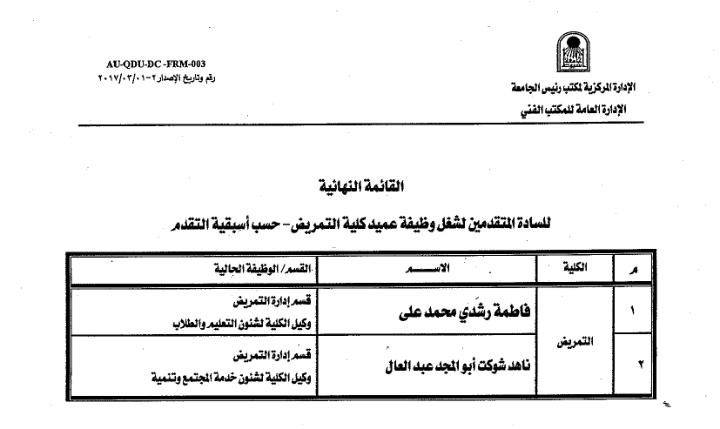 Assiut University's nomination committee, headed by Assiut University President Dr. Ahmed El-Minshawy, announced the final list of applicants for the position of dean of the Faculty of Nursing, according to the order of precedence.