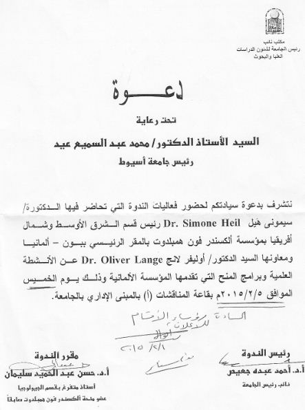 The Alexander Von Humboldt-Foundation will hold a syposium in assiut university about its grants on Thursday 5/2/2015 in the discussion hall in the administration building. The participants of this symposium will be Dr. Simone Heil, Programme Director in Africa, Middle East, and her assistance Dr. Oliver Lange.