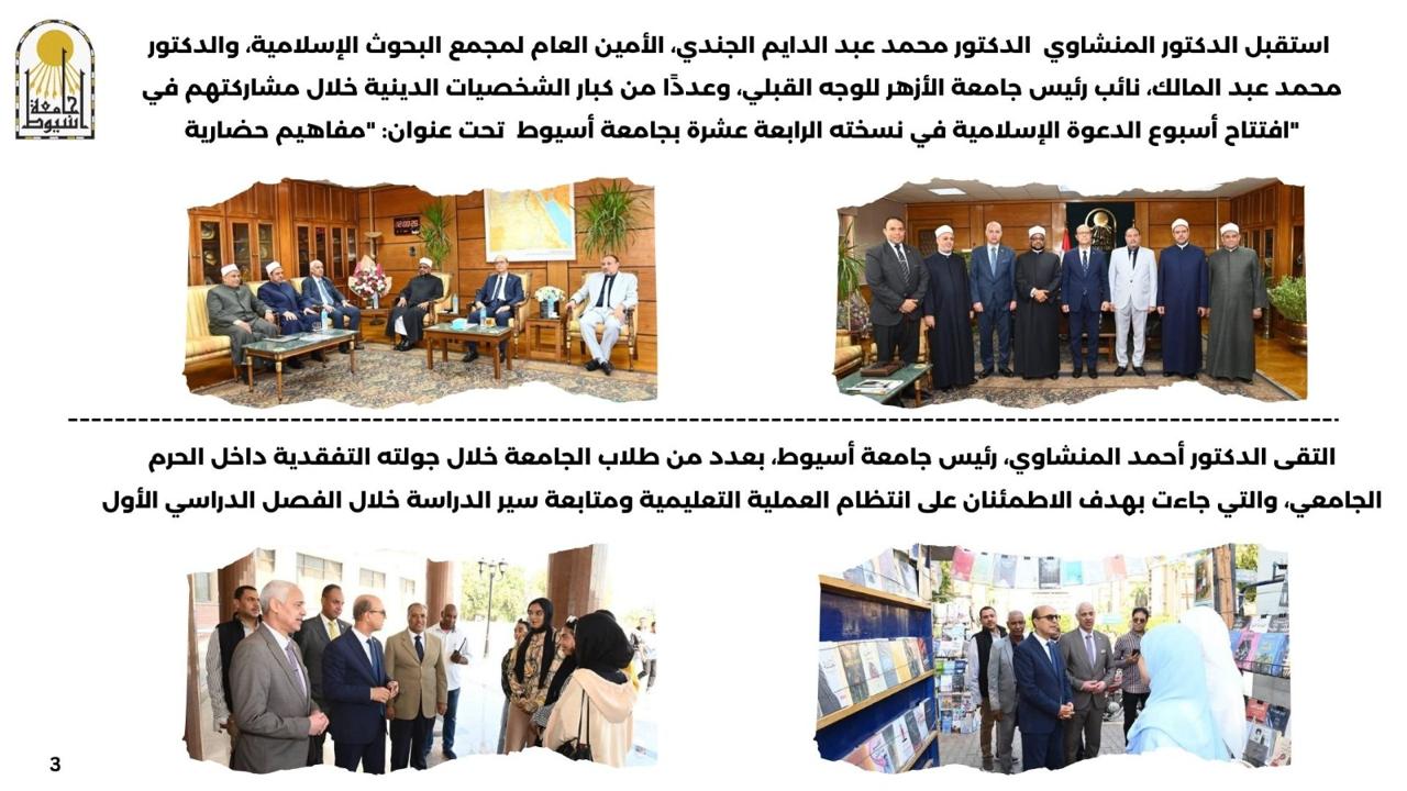 استقبل الدكتور أحمد المنشاوي رئيس جامعة أسيوط، كلًّا من الدكتور محمد عبد الدايم الجندي الأمين العام لمجمع البحوث الإسلامية، والدكتور محمد عبد المالك نائب رئيس جامعة الأزهر للوجه القبلي، وعددًا من كبار الشخصيات الدينية، خلال مشاركتهم في فعاليات أسبوع الدعوة الإسلامية في نسخته الرابعة عشرة المنعقد في جامعة أسيوط هذا العام تحت عنوان: "مفاهيم حضارية".