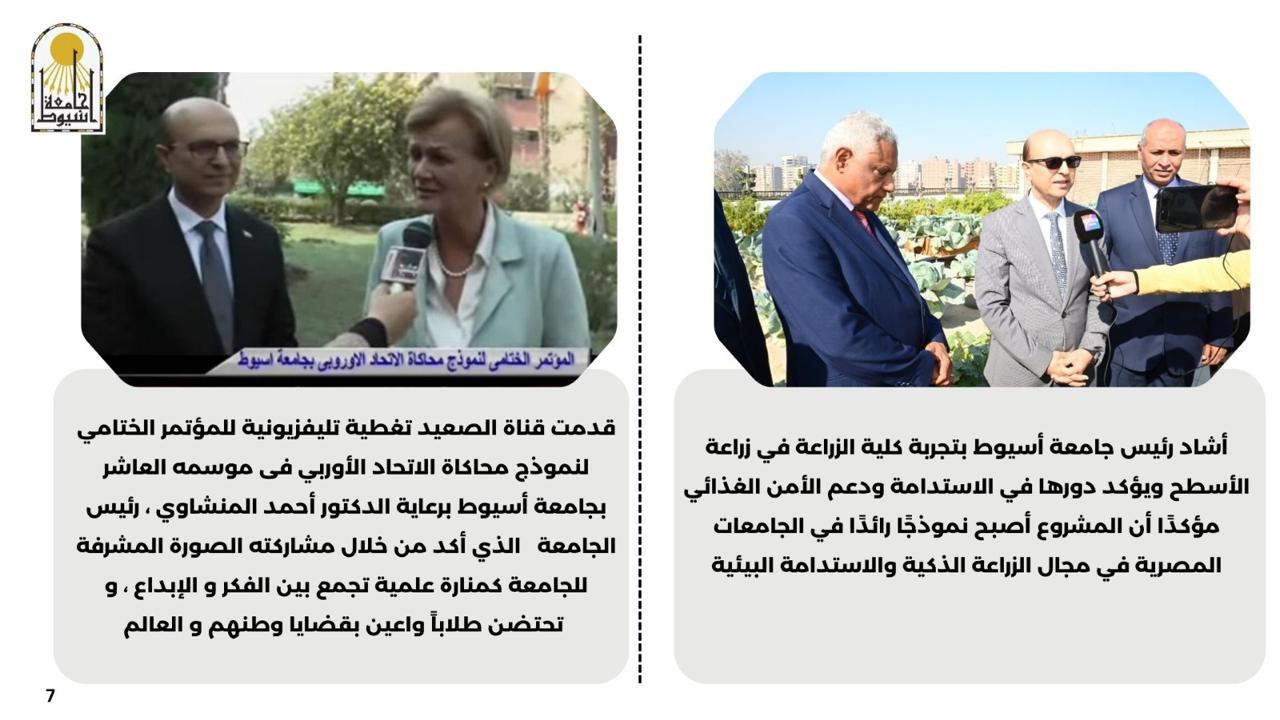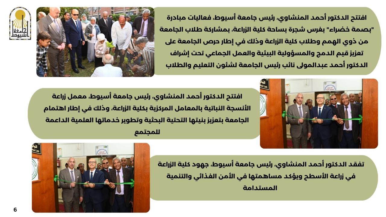 حيث شهدت جامعة أسيوط العديد من الفعاليات والأنشطة والتي عكست التزام الجامعة بالتميز الأكاديمي، والمشاركة الفعالة في قضايا المجتمع، وعززت مكانتها كمؤسسة تعليمية رائدة تسهم في تحقيق أهداف التنمية المستدامة ورؤية مصر 2030