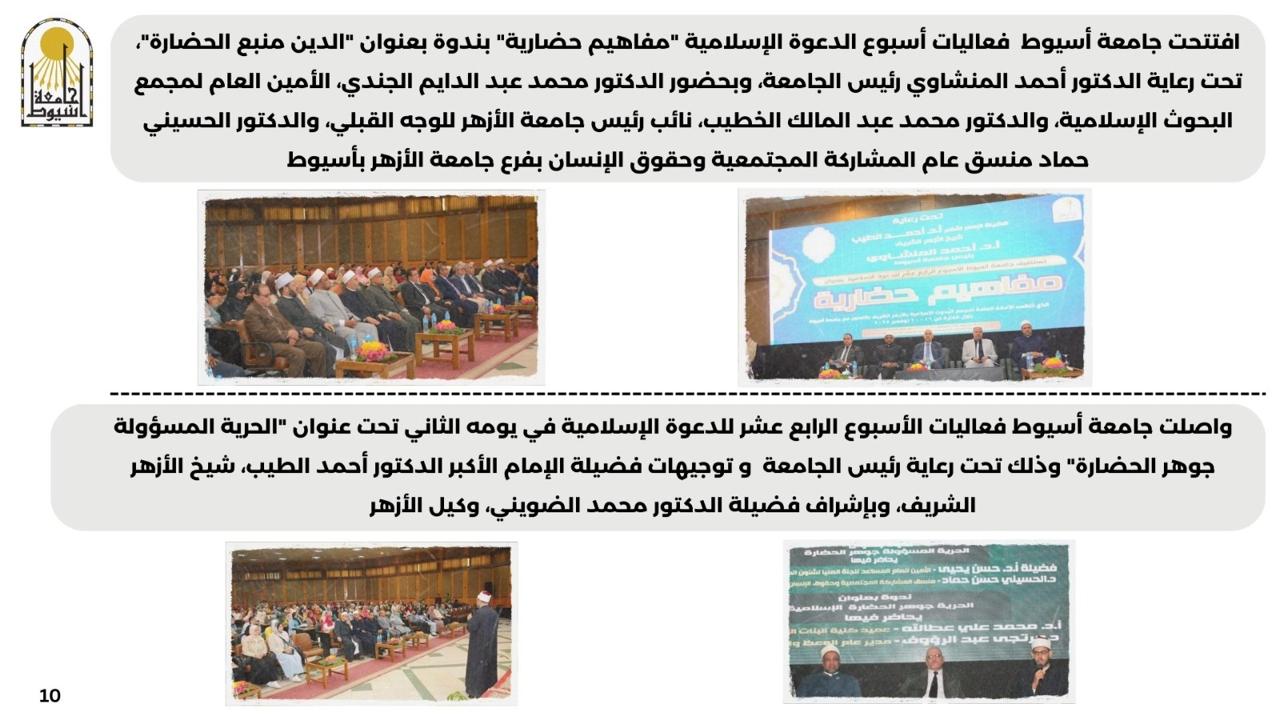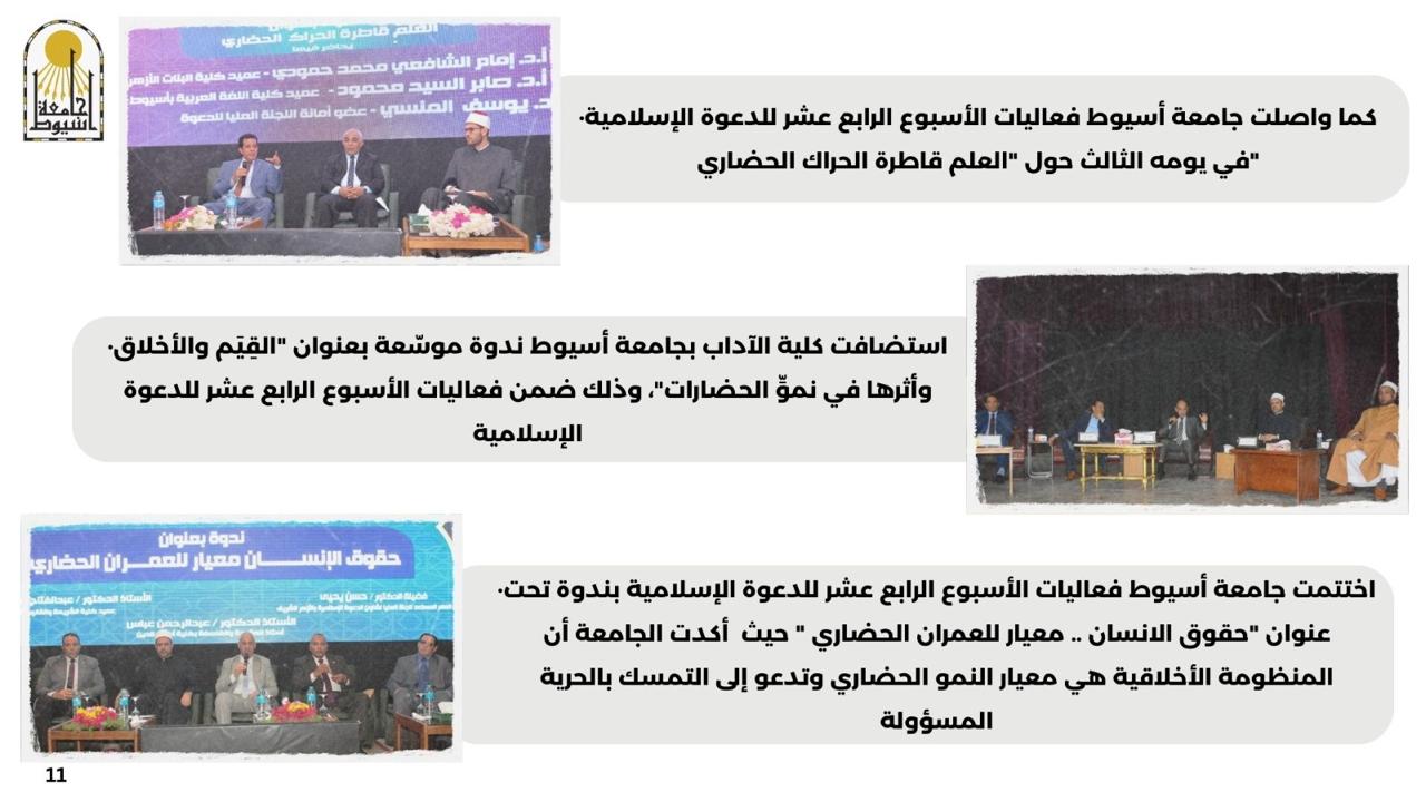 • كما واصلت جامعة أسيوط فعاليات الأسبوع الرابع عشر للدعوة الإسلامية في يومه الثالث حول "العلم قاطرة الحراك الحضاري"