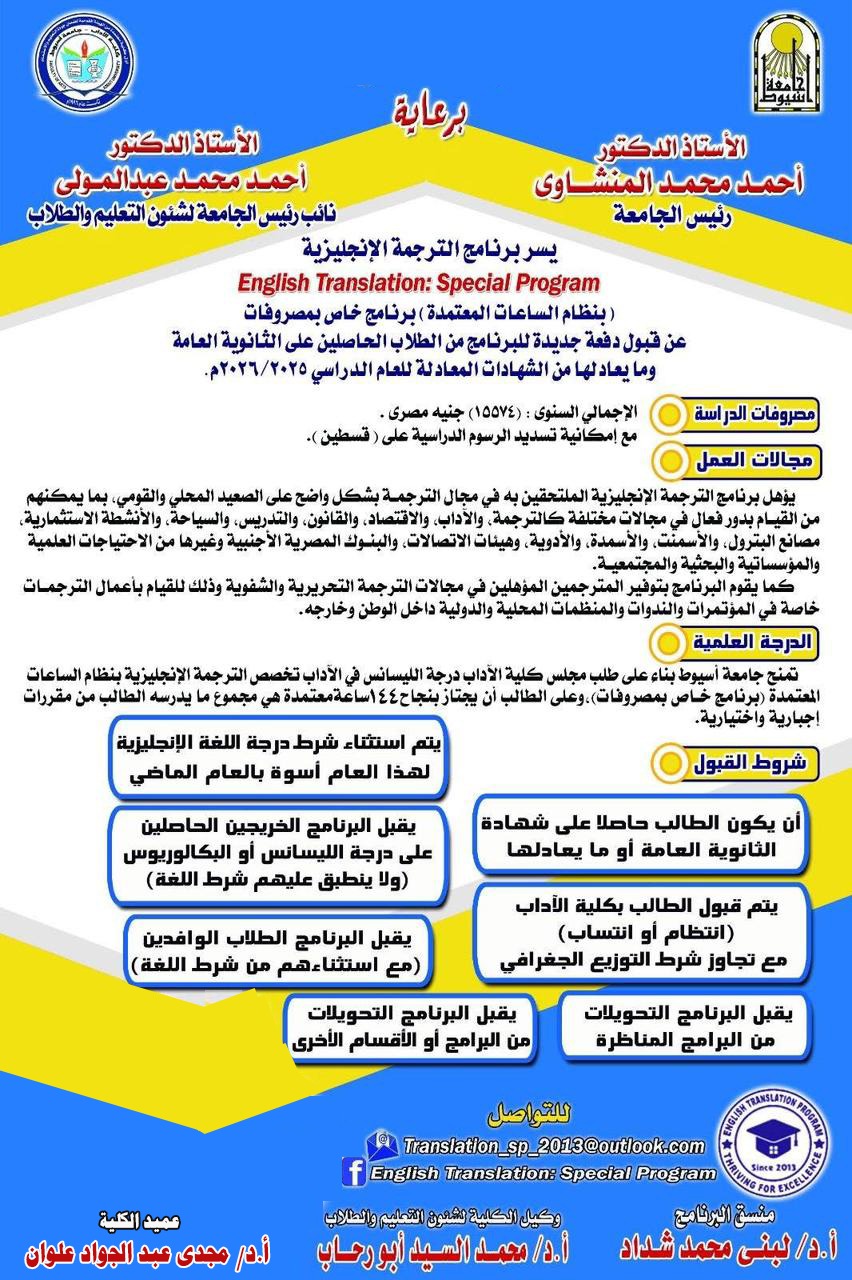 في إطار حرص جامعة أسيوط على تطوير منظومتها التعليمية وتقديم برامج أكاديمية حديثة تواكب احتياجات سوق العمل، أعلنت كلية الآداب عن طرح برنامج الترجمة باللغة الإنجليزية بنظام الساعات المعتمدة، كنموذج للبرامج المتخصصة التي تجمع بين الدراسة النظرية والتطبيقية.
