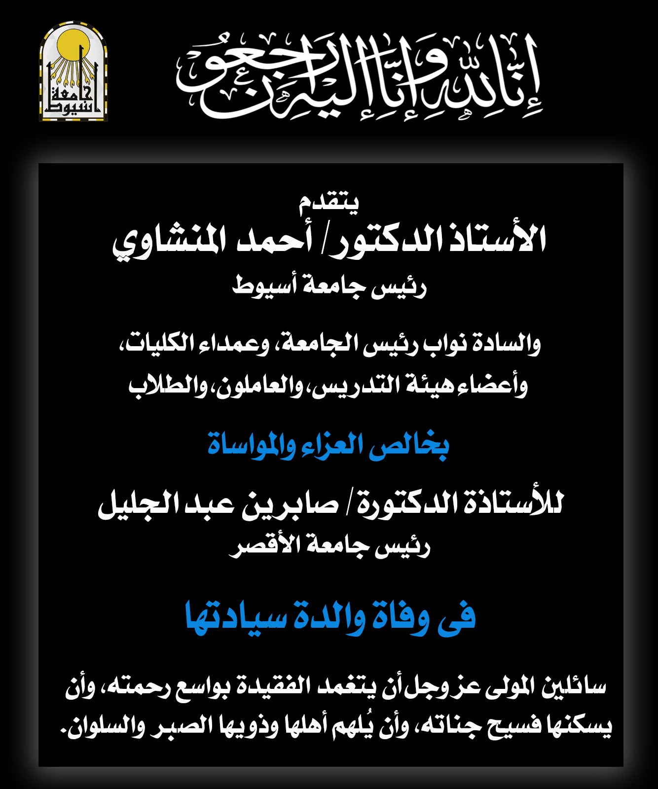 يتقدم الأستاذ الدكتور أحمد المنشاوي، رئيس جامعة أسيوط، بخالص العزاء والمواساة إلى الأستاذة الدكتورة صابرين عبد الجليل، رئيس جامعة الأقصر، في وفاة المغفور لها بإذن الله والدتها.