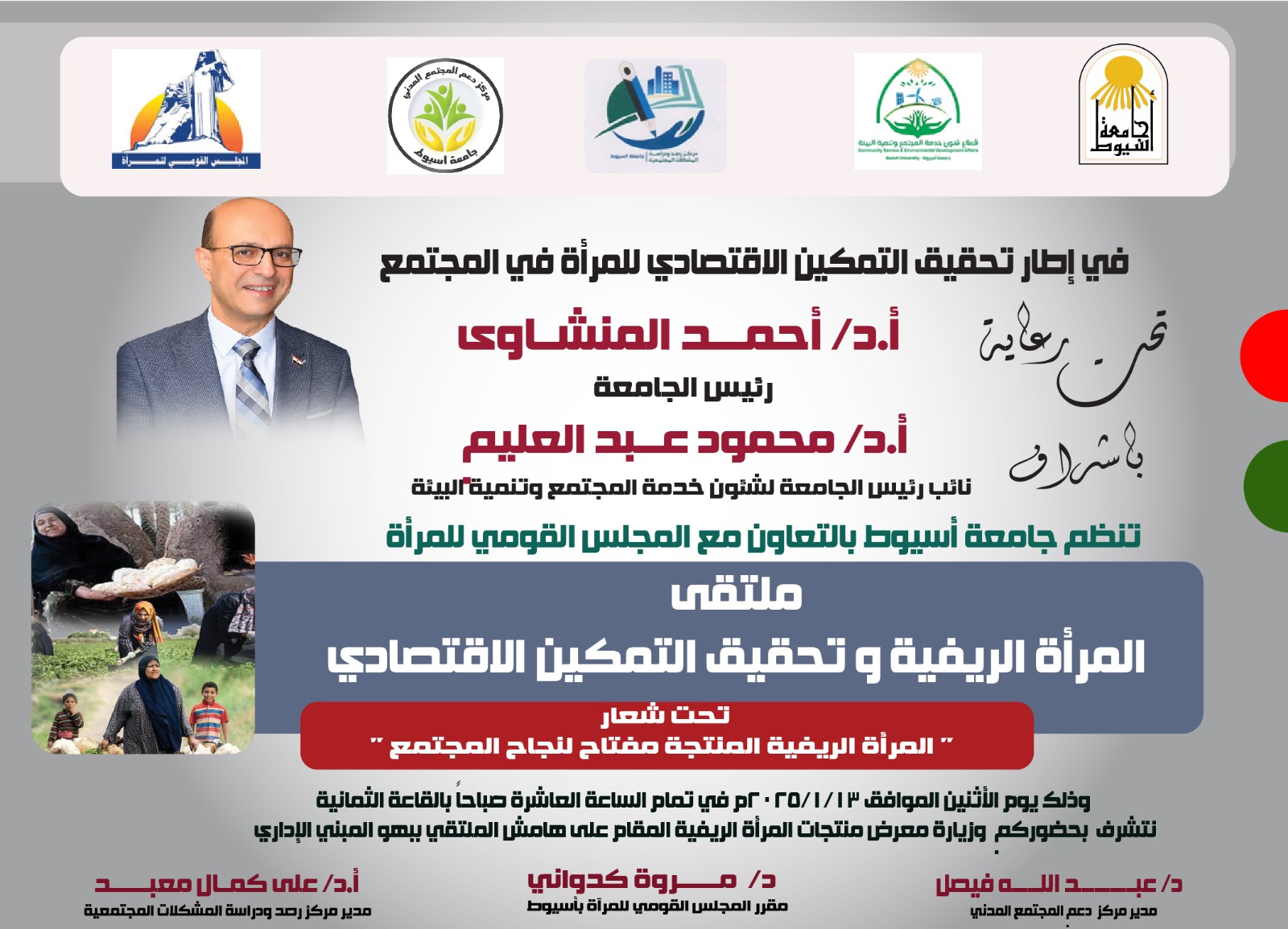 الدكتور محمود عبدالعليم نائب رئيس الجامعة لشئون خدمة المجتمع وتنمية البيئة، ملتقى "المرأة الريفية وتحقيق التمكين الاقتصادي"، تحت شعار: "المرأة الريفية المنتجة.. مفتاح لنجاح المجتمع"، بالتعاون مع المجلس القومي للمرأة وذلك يوم الإثنين المقبل الموافق ١٣ من يناير، في تمام الساعة العاشرة صباحاً؛ بالقاعة الثمانية، بالمبنى الإداري بالجامعة.