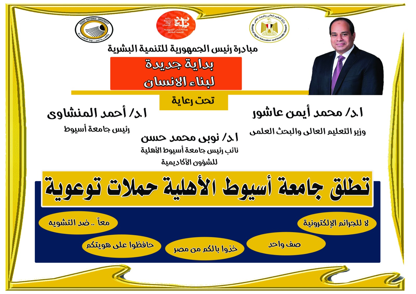 إيماناً بتوجهات الدولة المصرية؛ نحو تطوير الإنسان، وتعزيز قدراته في جميع المجالات؛ أطلقت جامعة أسيوط الأهلية؛ سلسلة من حملات التوعية؛ بمخاطر حروب الجيل الرابع، والخامس، ضمن فعاليات المبادرة الرئاسية: (بداية جديدة؛ لبناء الإنسان)، وذلك مساهمة منها في تعزيز الوعي لدى طلابها، وحرصاً منها على المشاركة في هذه الخطوة الاستراتيجية المهمة؛ نحو تحقيق خطة الدولة للتنمية المستدامة؛ بمفهومها الشامل.