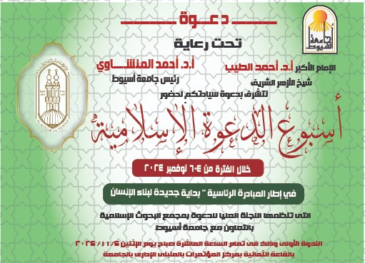 ينطلق في رحاب جامعة أسيوط، اعتباراً من غداً الإثنين ٤ من نوفمبر؛ أسبوع الدعوة الإسلامية، بعنوان: «العقيدة وبناء الإنسان»، تحت رعاية الدكتور أحمد المنشاوي رئيس جامعة أسيوط، والذي تنظمه اللجنة العليا للدعوة، بمجمع البحوث الإسلامية، في إطار توجيهات فضيلة الإمام الأكبر الدكتور أحمد الطيب شيخ الأزهر؛ بتكثيف البرامج، والفعاليات الدعوية، والتوعوية؛ بما يحقق دور الأزهر، ورسالته.