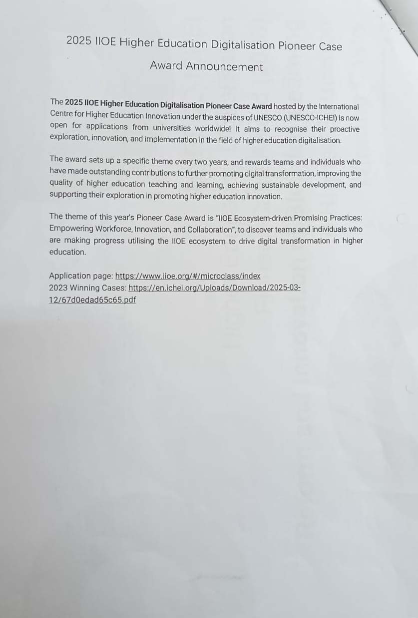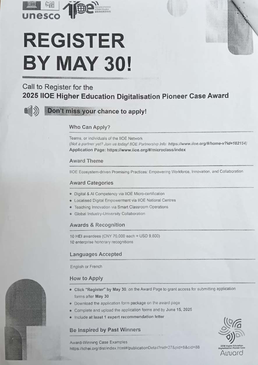 بدء تلقي الترشيحات لجائزة الرواد في رقمنة التعليم العالي لعام 2025 ضمن المبادرة الدولية للتعليم العالي عبر الانترنت تحت عنوان الممارسات الواعدة المدفوعة بمنظومة المبادرة الدولية للتعليم عبر الانترنت: تمكين القوى العاملة وتعزيز الابتكار وتفعيل التعاون المؤسسي، علما بأن آخر موعد للتقديم هو 30/5/2025