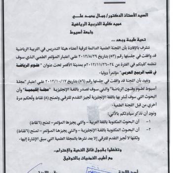 اللجنة العلمية الدائمة للترقية لوظائف الاساتذة والاساتذة المساعدين قد وافقت بجلستها المنعقده فى 17/10/2012 على اعتبار مجلة اسيوط لعلوم وفنون الرياضة والتى سوف تصدر باللغة الانجليزية -مجلة اقليمية- و…