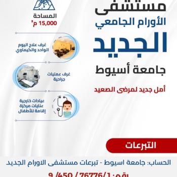 تعلن جامعة أسيوط عن فتح باب التبرعات لمستشفى الأورام الجامعي الجديد، لدعم المرضى وتوفير أفضل الخدمات الطبية لهم.