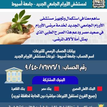 جامعة أسيوط تعلن رقم حساب التبرعات لصالح مستشفى الأورام الجامعي الجديد