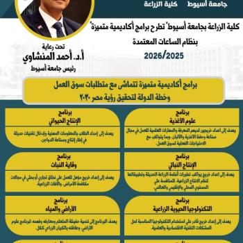 تحت رعاية الدكتور أحمد المنشاوي، رئيس جامعة أسيوط، أعلنت كلية الزراعة عن طرح حزمة متنوعة من البرامج الدراسية بنظام الساعات المعتمدة للعام الجامعي 2025 / 2026، والبالغ عددها (8) برامج دراسية (عام…