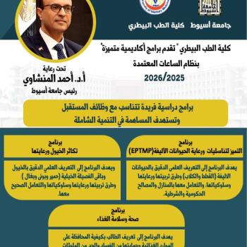 تحت رعاية الدكتور أحمد المنشاوي رئيس جامعة أسيوط، أعلنت كلية الطب البيطري عن طرح ثلاثة برامج دراسية بنظام الساعات المعتمدة (بمصروفات دراسية) لمرحلة البكالوريوس، وذلك اعتباراً من العام الجامعي 2025/…