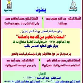 ينظم قطاع خدمة المجتمع وتنمية البيئة بكلية الهندسة مع قسم هندسة التعدين والفلزات بالكلية ورشة عمل بعنوان "البحث والتطوير بين الجامعة والصناعة"يوم الأحد الموافق 17/3/2013 فى تمام الساعة العاشرة صباحاً…