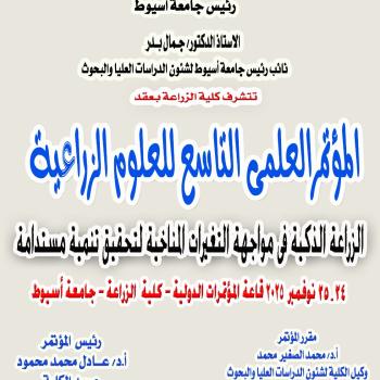 الاثنين… انطلاق المؤتمر العلمي التاسع للعلوم الزراعية بجامعة أسيوط تحت عنوان "الزراعة الذكية في مواجهة التغيرات المناخية لتحقيق تنمية مستدامة" تنطلق يوم الاثنين 24 نوفمبر 2025 بقاعة المؤتمرات…