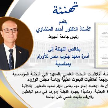 يتقدم الأستاذ الدكتور أحمد المنشاوي، رئيس جامعة أسيوط، بخالص التهنئة إلى أسرة معهد جنوب مصر للأورام بمناسبة تسجيل لجنة أخلاقيات البحث العلمي بالمعهد في اللجنة المؤسسية لمراجعة أخلاقيات البحوث الطبية…