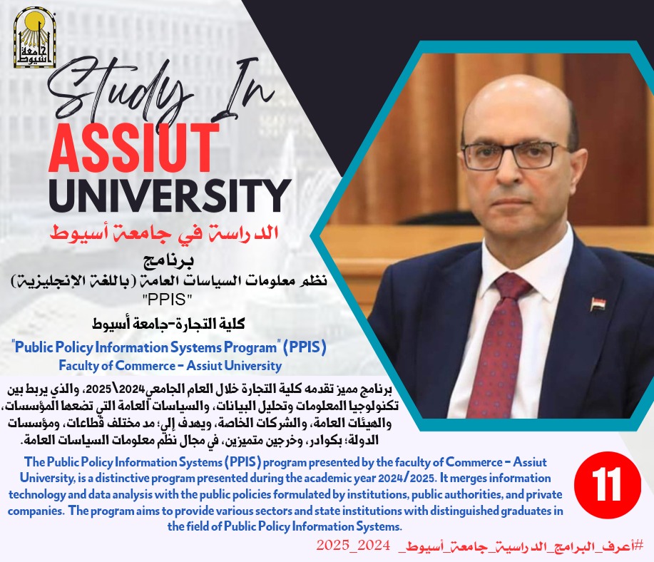 ? تقدم كلية التجارة بجامعة أسيوط؛ برنامج نظم معلومات السياسات العامةPublic Policy Information Systems " PPIS"، باللغة الإنجليزية بنظام الساعات المعتمدة، وهو برنامج يربط بين تكنولوجيا المعلومات وتحليل البيانات، والسياسات العامة التي تضعها المؤسسات، والهيئات العامة، والشركات الخاصة، ودعم عملية اتخاذ القرار؛ للوصول لأفضل الحلول للمشكلات التى تواجه القطاع الحكومي، أو الخاص؛ في إطار استراتيجية التحول الرقمي التي تنشدها مصر، ودول العالم.