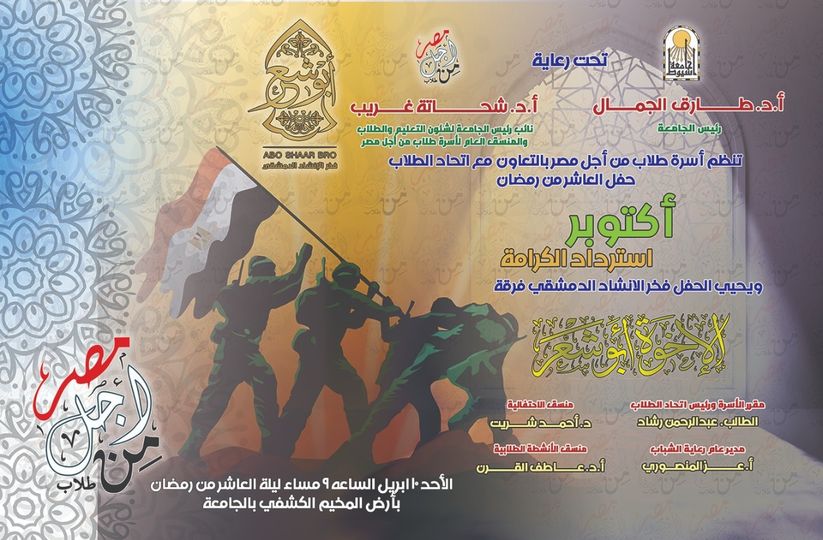 Tariq El-Gamal, President of Assiut University, announced that today, Sunday, April 10, 2022, Assiut University will celebrate the anniversary of the victory of the tenth of Ramadan, “October Restoration of Dignity,” which is organized by the family of Students for Egypt in cooperation with the University Students Union, which is scheduled to witness the attendance of Major General Essam Saad, Governor of Assiut, the leaders of the Southern Military District, members of the House of Representatives, Senate, Islamic and Christian clerics, and members of the university family, including faculty members, staff and students.