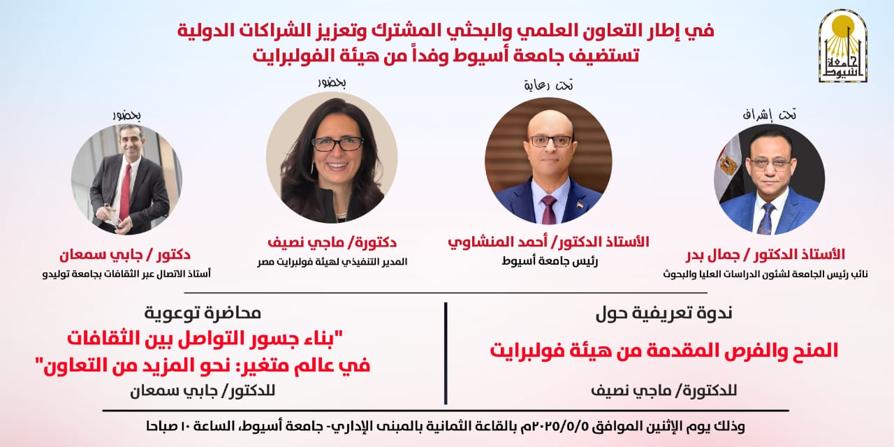 Within the framework of research cooperation with international institutions, Assiut University is organizing an introductory seminar and an awareness lecture in cooperation with the Fulbright Commission, under the supervision of Dr. Ahmed El-Minshawy, president of the University, and with the participation of a Fulbright Commission delegation headed by Dr. Maggie Nassif, executive director of the commission, on Monday, May 5, 2025, under the supervision of Dr. Jamal Badr, vice president for graduate studies and Research Affairs.