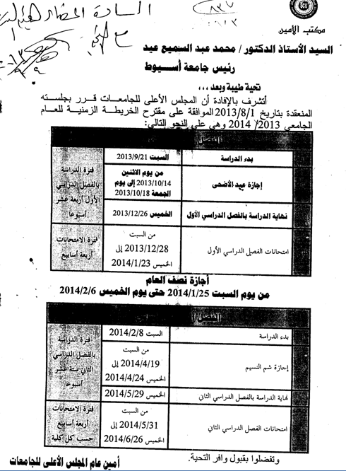 The supreme council of the university approved the time schedules for the academic year 2013-2914, as follows:The beginning of the academic year: 21-9-2013Eid El-Adha : 17-10-2013The exams of the first semester: 28-1-2013 to 23-1-2014The holiday of the first semester: 25-1-2014 to 6-2-2014The beginning of the second semester: 8-2-2014