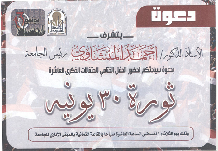 The closing ceremony of Assuit University’s celebration of the 10th Anniversary of June 30 Revolution will be held tomorrow, Tuesday, in which the university participated in a number of events and activities during July so as to ensure that the processes of construction and development will be completed and that work will continue.