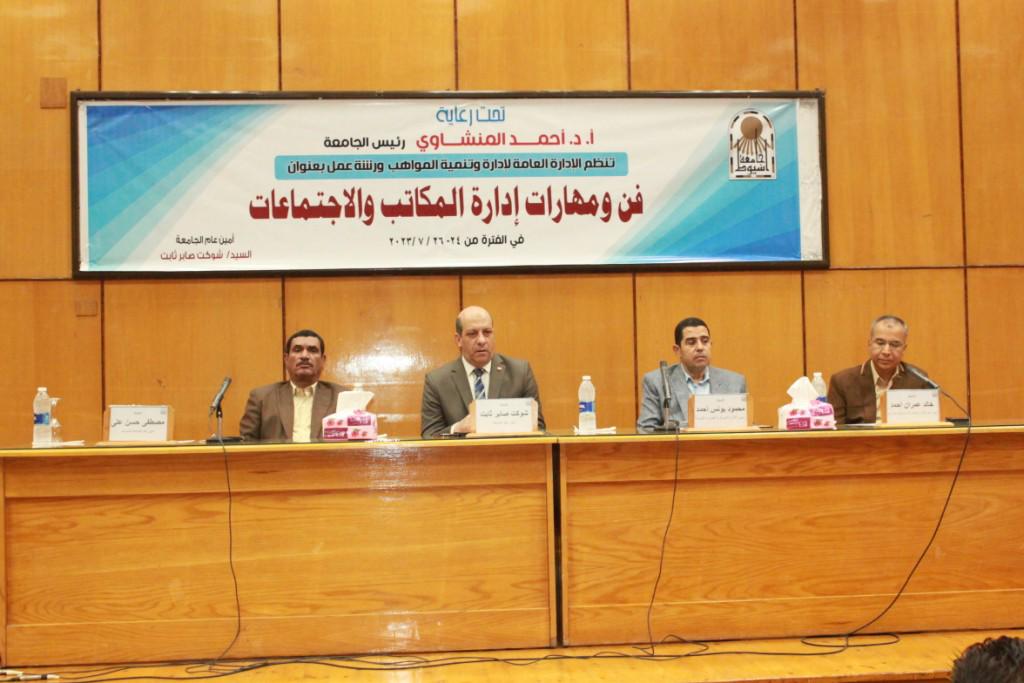 In this context, the General Administration for Talent Management and Development organized a workshop entitled “Art and Skills of Office and Meeting Management” under the auspices of Prof. Ahmed Al-Menshawi, President of Assuit University and in the presence of Mr. Shawkat Saber Thabet, Secretary General of the University; Mr. Moustafa Hassan, Assistance Secretary of the University; Mr. Mahmoud Younes Ahmed, head of the Central Administration for Human Resources; Mr. Khaled Omran, General Manager of the General Administration for Talent Management and Development; and with the participation of 50 staff members of the Secretariat Sector in various sectors of the University. The workshop was held during the period from July 24 to July 26 July in the Seminar Hall of the Administrative Building.