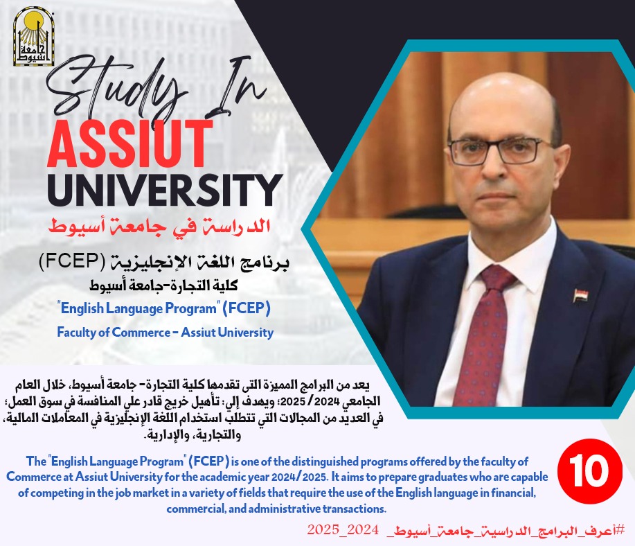 The Faculty of Commerce at Assiut University presents the "English Language" program (FCEP), which is one of the distinguished programs aimed at preparing graduates who can compete in the job market in fields that require the use of the English language in financial, commercial, and administrative transactions. The program is supervised by Prof. Ahmed Abdel Mawla, Vice President for Education and Student Affairs, Prof. Alaa Abdel Hafeez, Dean of the Faculty of Commerce, Prof. Taha Zakaria Abu Kareisha, Program Coordinator, and Prof. Jacqueline Alfie, Deputy Program Coordinator.