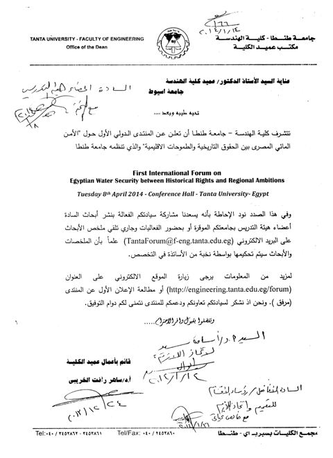 Tanta university will hold The First Forum on Egyptian Water Security Between Historical Rights and Regional Ambitions. Research papers can be sent to this email:TantaFourm@f-eng.tanta.edu.eg