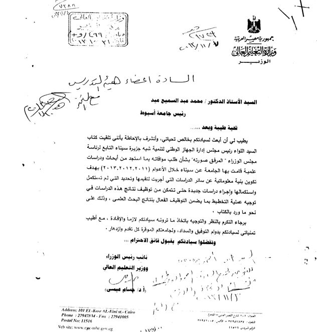The head of the national agency of sinai peninsula asked the head of assiut university to send him the scientific researches and studies that the university did in the latest three years (2011-2012-2013) to make an information database to evaluate them.