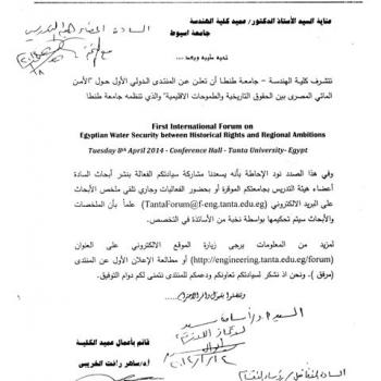 Tanta university will hold The First Forum on Egyptian Water Security Between Historical Rights and Regional Ambitions. Research papers can be sent to this email:TantaFourm@f-eng.tanta.edu.eg