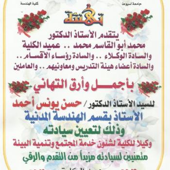 The dean of the faculty professor Muhammad Abu El-Kassem and the whole faculty members would like to congratulate the new vice dean of the community services and environment development, professor…