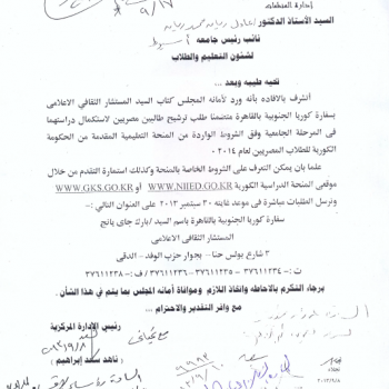 The Korean embassy in cairo sent a letter to the vice-prseident of assiut university and the dean of the faculty to nominate two egyptian students to complete their studies in korea according to the…