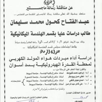 The mecahnical engineering department has approved to form a jury committee to evaluate the master thesis proposed by eng Abd El-Fattah Kahool Muhammad Soliman (postgraduate student) on Wednesday 2…