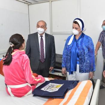 Assiut University President Dr. Tarek El-Gammal visits a student after undergoing a delicate surgery to connect her amputated arm and presents her with a CD and textbooks as a gift.
