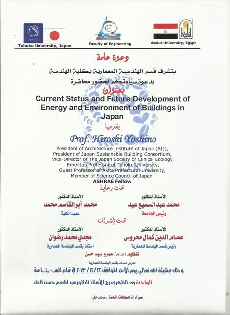 The Architectural Engineering department invites the faculty staff to attend a lecture entitled as: "Curent Status and Future Development of Energy and Enviroment of Buildings in Japan"The lecture will be held on Saturday 22-12-2013 at 1:00 p.m in professsor Abd El-Moniem Hassan Kamel amphitheatre.