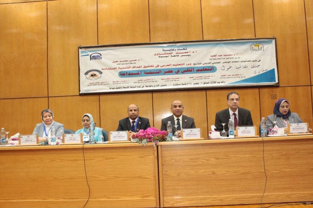The conference organized a panel discussion on "medical education in the era of sustainable development", within the conference activities, in the presence of Dr. Mahmoud Abdul Alim, vice president of the University for Community Service and Environmental Development Affairs, Dr. Hassan Hawil, dean of the faculty of Education, Dr. Ahmed Makhlouf, dean of the faculty of Medicine, Badr University, Dr. Amani Omar, vice dean of the faculty of medicine for graduate studies and Research Affairs, Dr. Amani Mohammed Sharif, advisor to the president of the University for Strategic Planning, Dr. Hoda Makhlouf, vice dean of the faculty of medicine for community service and environmental development, and Dr. Mohammed Jaber Qasem, vice dean of the faculty of education for educational affairs the students, in the presence of a constellation of agents and faculty members, from various faculties of the university, and a group of Assiut University students.