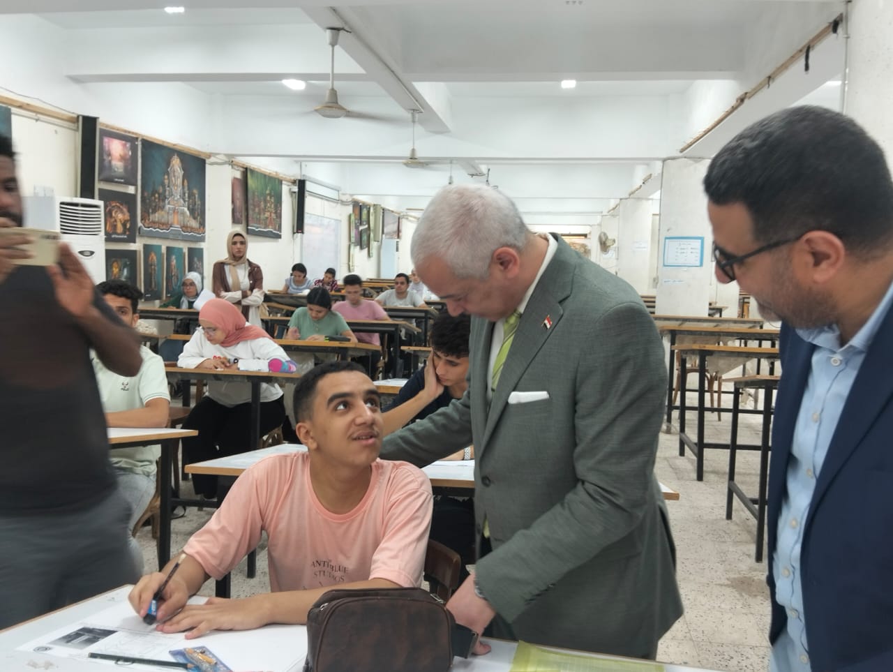 During his tour at the College of Fine Arts, Dr. Ahmed Abdulmawla was accompanied by Dr. Mohammed Helmy Al-Hefnawi, dean of the College, Dr. Mohammed Abdul Hakim, vice dean for education and Student Affairs, Mr. Mukhlas Farouk Ayad, Secretary of the college, and a number of faculty members and staff, where the examination committees inspect and check on their progress in accordance with the organized procedures.