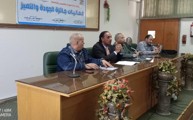 و فريق الجودة والتميز وبحضور لفيف من السادة أعضاء هيئة التدريس والعاملين بالكلية تم بدء اللقاء بتقديم السيد / حسام على عمر عرض توضيحي وشرح الجوائز وآليات التقدم وسبل الدعم الفني ثم قام بالرد على استفسارات السادة أعضاء هيئة التدريس والعاملين بالكلية، وحضر اللقاء فريق الجودة والتميز بالجامعة كلا من
