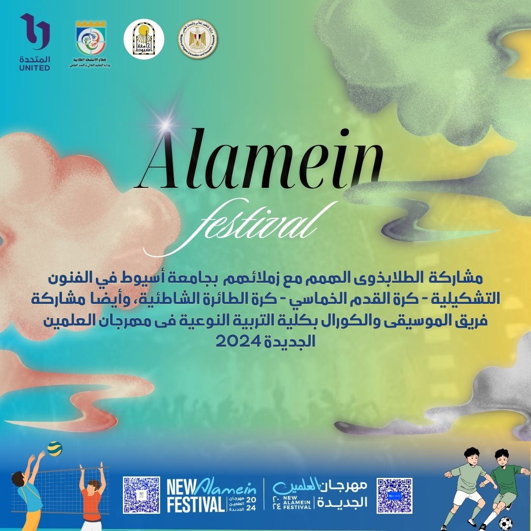 في إطار فعاليات مهرجان العلمين الجديدة 2024م، ومشاركة طلاب الجامعات المصرية، الذي تنظمه وزارة التعليم العالي والبحث العلمي، تحت رعاية الدكتور محمد أيمن عاشور، وزير التعليم العالي والبحث العلمي، بالتعاون مع الشركة المتحدة، وجامعة أسيوط، وقطاع الأنشطة الطلابية بالوزارة، تشارك جامعة أسيوط في المهرجان، تحت رعاية الدكتور أحمد المنشاوي رئيس جامعة أسيوط، بالكثير من الفعاليات الفنية، والرياضية، والثقافية.