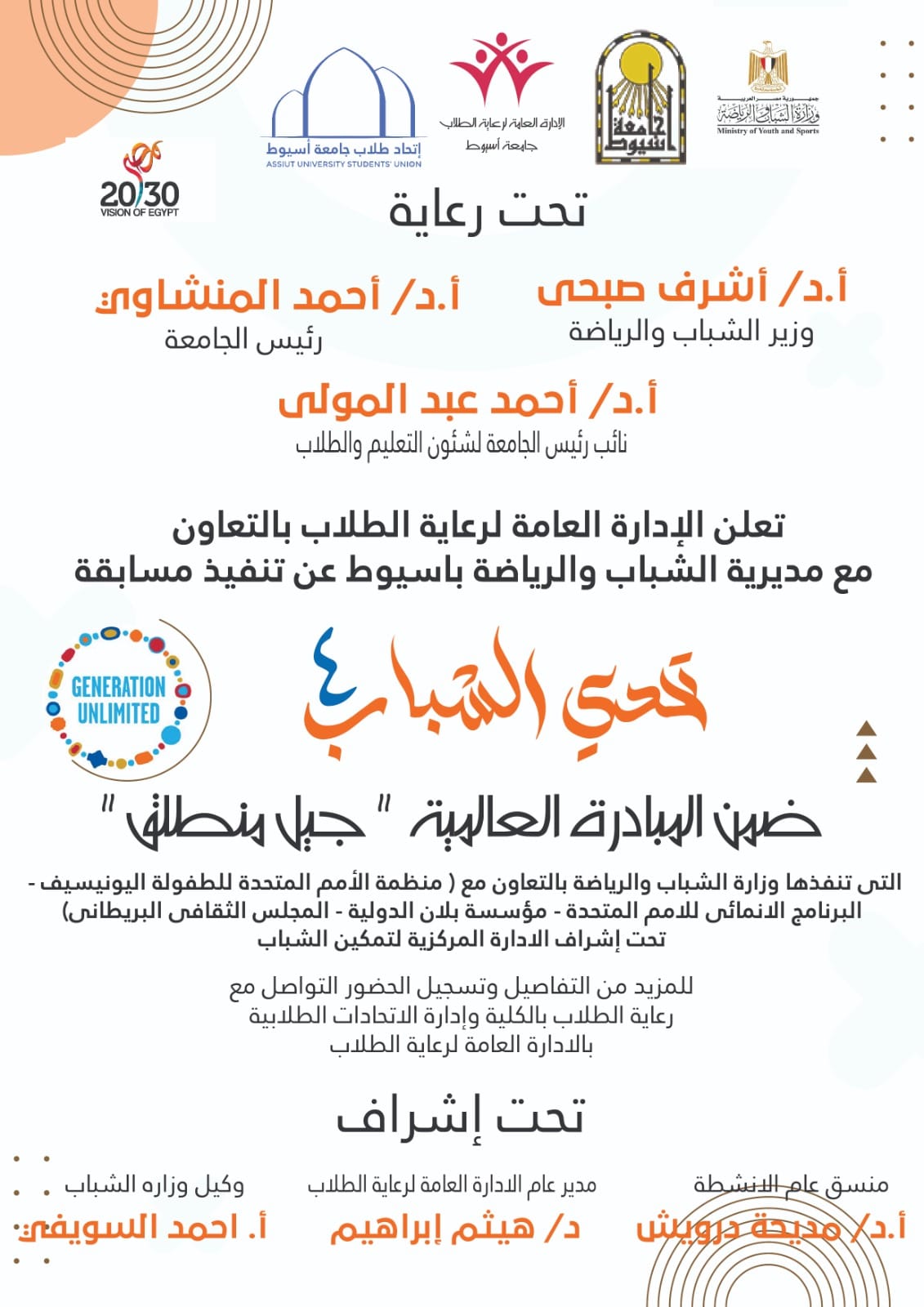 دعوة لمشاركة الطلاب والطالبات في مسابقة( تحدي الشباب ٤ )ضمن المبادرة العالمية " جيل منطلق " التي تنفيذها وزارة الشباب والرياضة بالتعاون مع ( منظمة الأمم المتحدة للطفولة اليونيسيف - البرنامج الانمائى للامم المتحدة - مؤسسة بلان الدولية - المجلس الثقافى البريطانى)