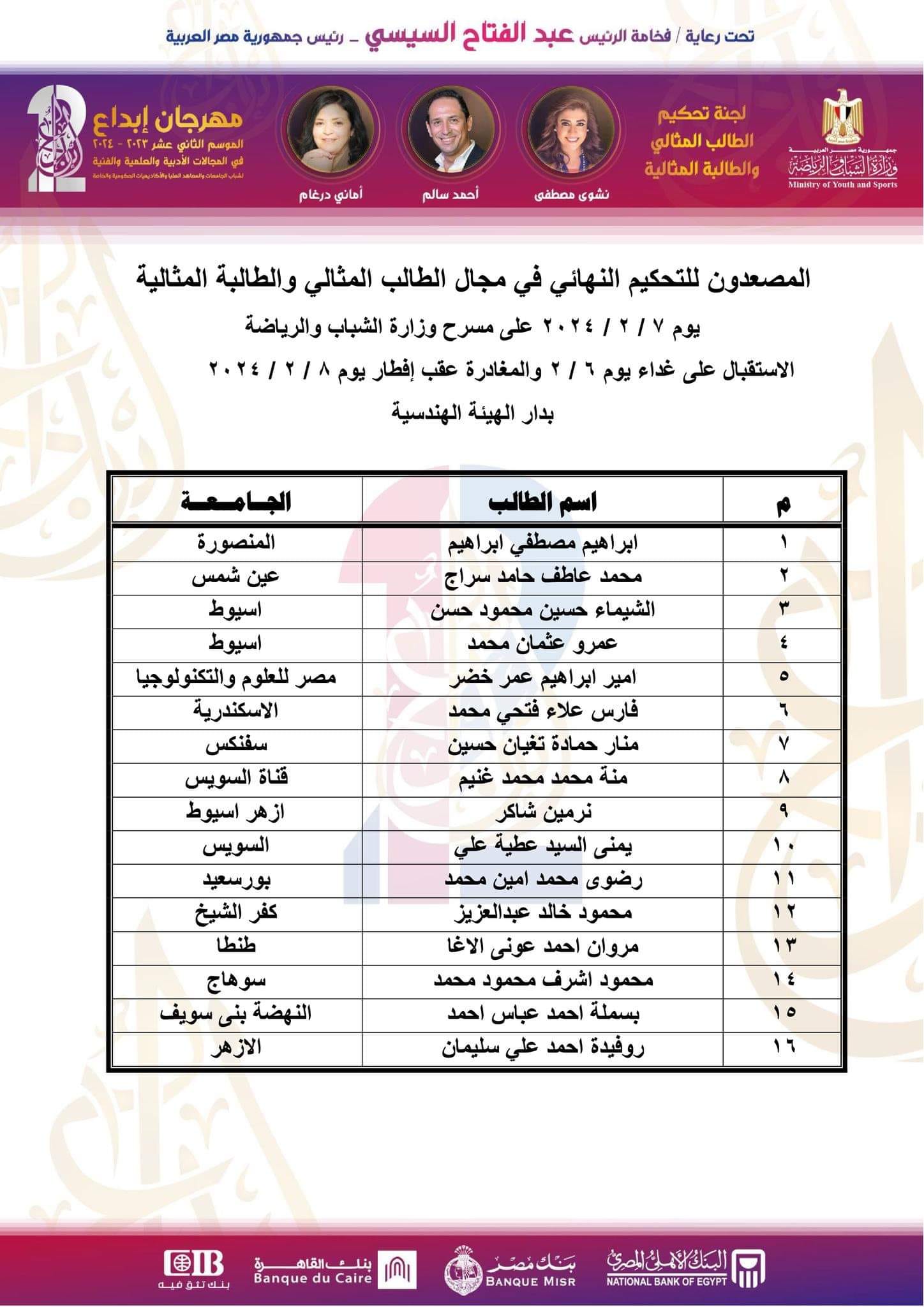 إدارة النشاط الاجتماعي والرحلات .. تم تصعيد جامعة أسيوط في مجال الطالب المثالي والطالبة المثالية مهرجان إبداع الموسم الثاني عشر في المجالات الثقافية والعلمية والفنية لطلاب الجامعات والمعاهد العليا والأكاديميات الحكومية والخاصة 2023 / 2024