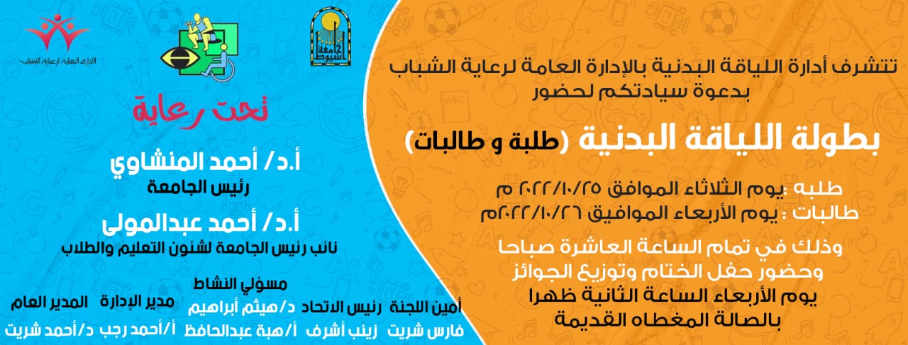 دعوة ... تتشرف ادارة اللياقة البدنية بالادارة العامة لرعاية الشباب بدعوة سيادكم لحضور بطولة اللياقة البدنية ( طلبة وطالبات ) وحفل الختام وتوزيع الجوائز وذلك يوم الاربعاء الموافق 26 اكتوير 2022م الساعة الثانية ظهرا بالصالة المغطاة القديمة